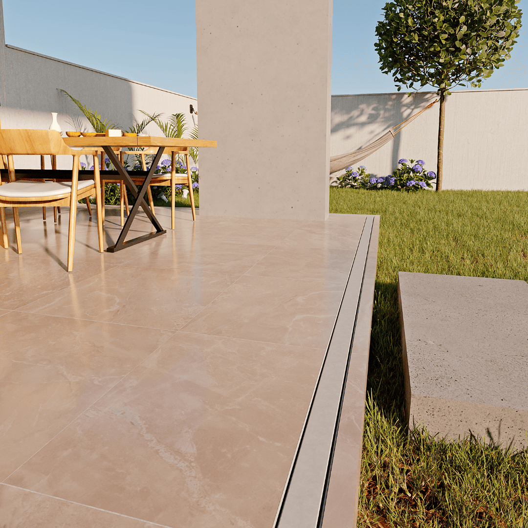 Este modelo oferece a drenagem oculta da linha "invisível", mas com um acabamento liso (aparente) e rebaixado em alumínio. É a escolha ideal para quem busca um visual moderno e minimalista, garantindo um arremate perfeito e robusto.