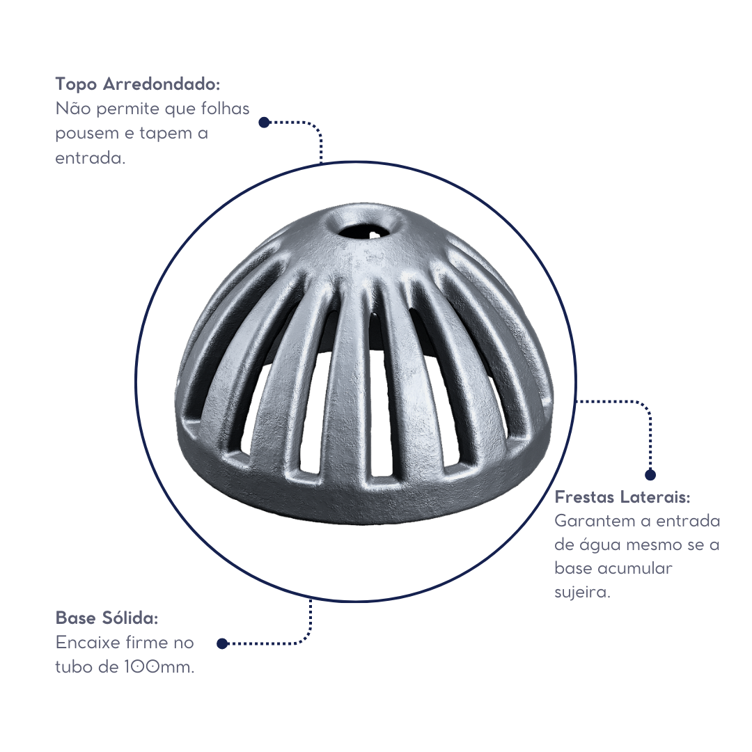 A proteção definitiva contra entupimentos. O formato domo impede a entrada de folhas e gravetos, mantendo o fluxo de água livre na sua tubulação